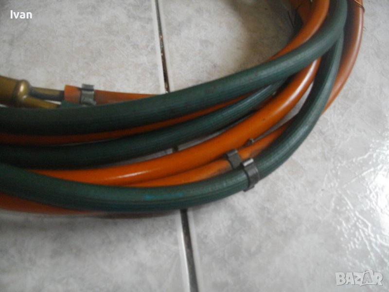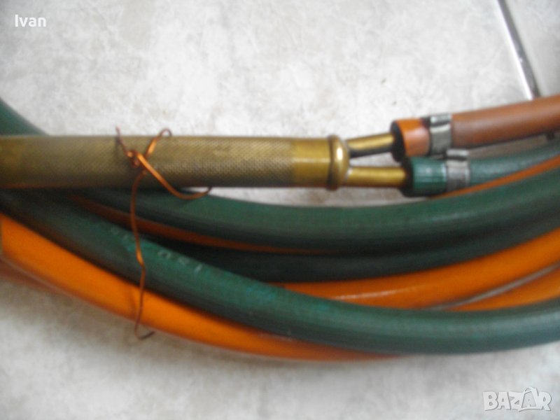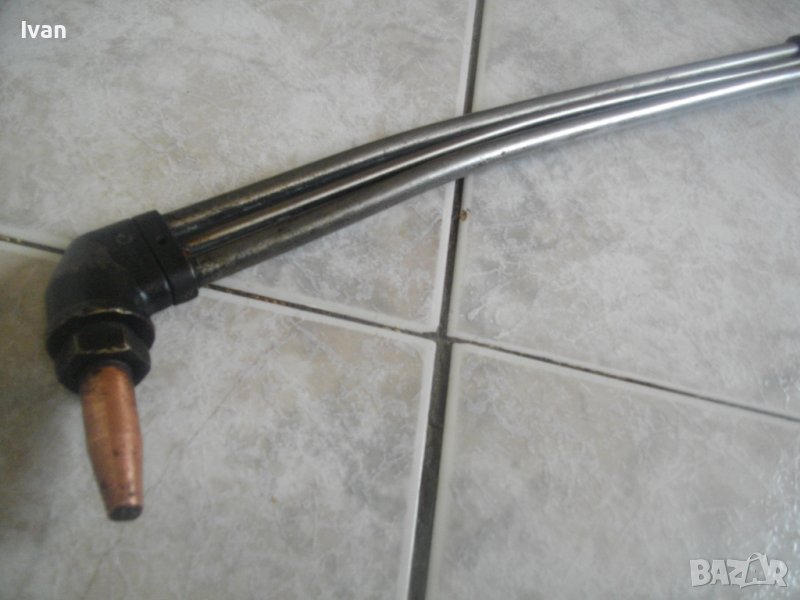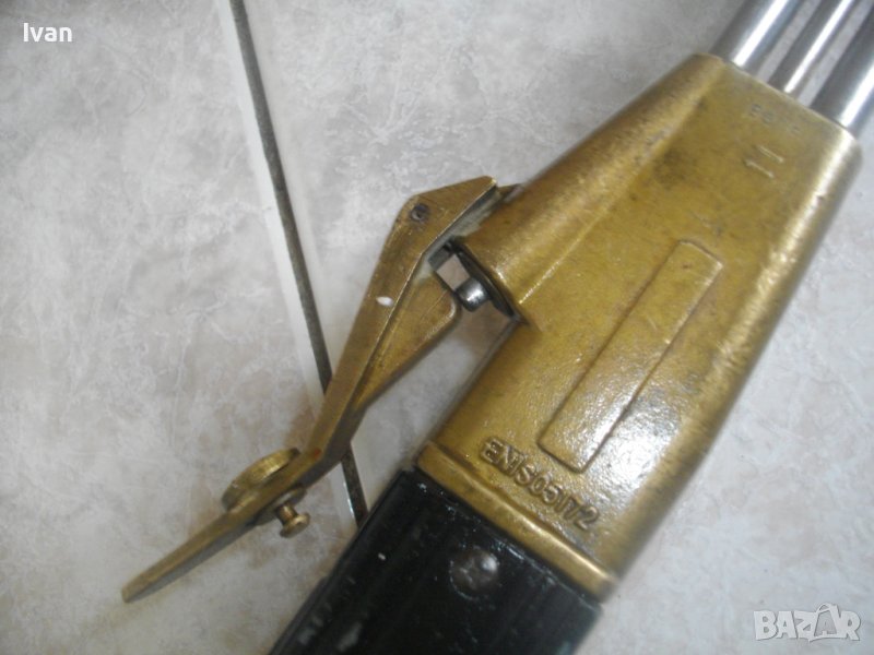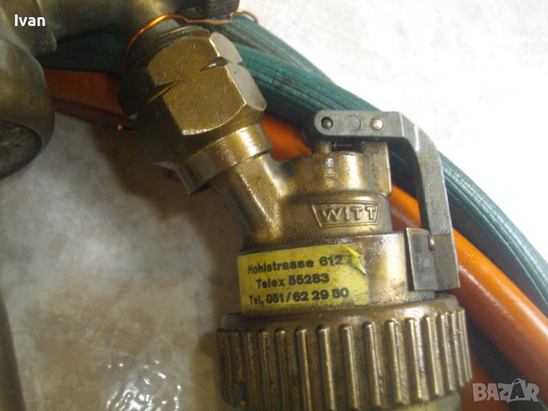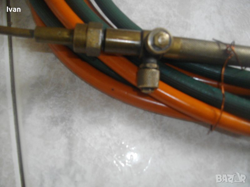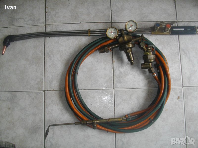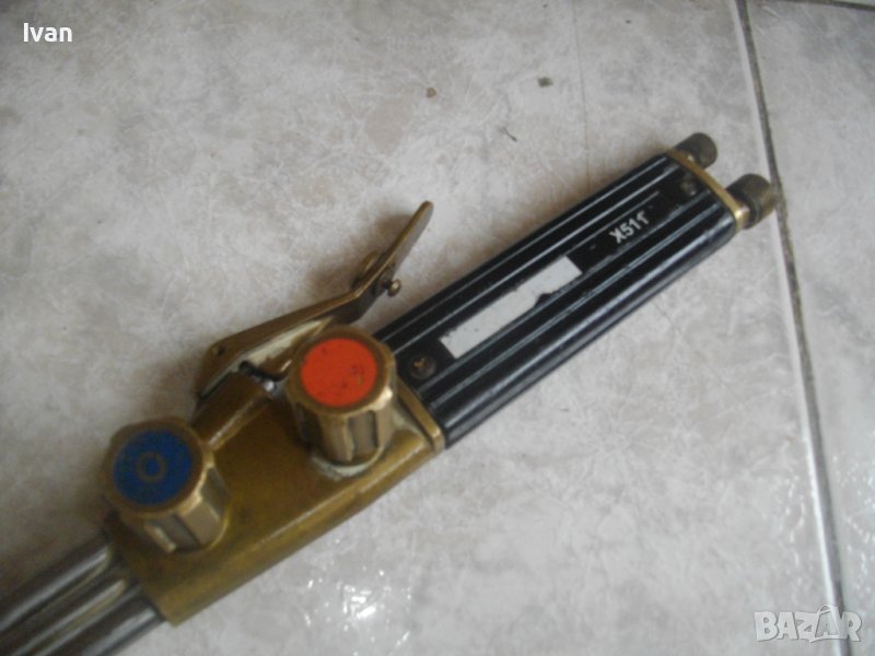 ОПИСАНИЕ на резак бронзов 33 см с маркучи и редуцир вентил за оксижен /газо-кислородно-ацетиленово рязане, запояване, заваряване/. НАЛИЧЕН. Цена 399 лв. Резак - бронзов изцяло, с 2 бронзови въртока и бронзова дръжка. Професионален. Дължина цялостна 330 мм. Поставена тънка медна контактна дюза за рязане. Към резака има два маркуча в добо състояние, без напуквания и без наранявания по тях. Дължина на маркучите - всеки по 5 м. Поставен масивен оригинален немски професионален редуцир вентил, изцяло бронзов. Марка на вентила WIT MULLER