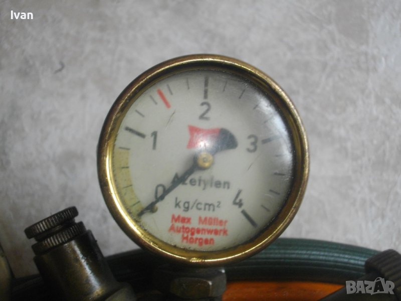 Поставени 2 манометъра оригинални за ацетилен, единият е 0-4 кг/кум.см, другият е 0-25 кг/куб.см. Вентила и монометрите са производство на TESPA - Zurih. Целият комплект резак с маркучи и вентил с манометри е в пълна изправност - техническа и работна. Цена на комплекта - 399 лв.
