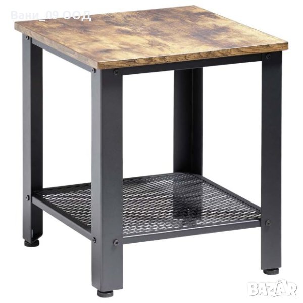 Квадратна помощна масичка с размери Ш:40/Д:40/В:45 см. Моделът разполага с красив плот с естествена дървесна декорация на тъмен орех. Конструкцията на масата е с четири крака, произведена от метал декориран в черен цвят. Под плота е монтиран метален решетъчен рафт за поставянето на малки предмети.