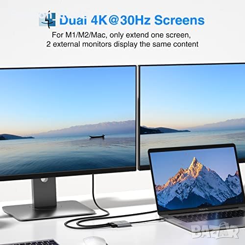 Този адаптер от USB C към двоен HDMI ви позволява да разширите един монитор до два външни монитора, като поддържа резолюция 2*4K*30Hz. Той е съвместим с широка гама лаптопи с USB C, включително Dell XPS, Lenovo Yoga, HP Spectre, Surface Book, Surface Go, Surface Pro и Surface Laptop. Въпреки това няма да работи с лаптопи, които нямат видеоизход или DP Alt Mode. Адаптерът осигурява кристално чисто 4K UHD изображение с максимална разделителна способност 4K@60Hz при използване на един HDMI и 4K@30Hz при използване на два HDMI порта. Адаптерът е лесен за използване, тъй като не изисква инсталиране на драйвери или софтуер, и е съвместим с всички нови лаптопи с USB-C/Type-C/Thunderbolt 3 с режим DP Alt на порта USB C.