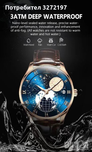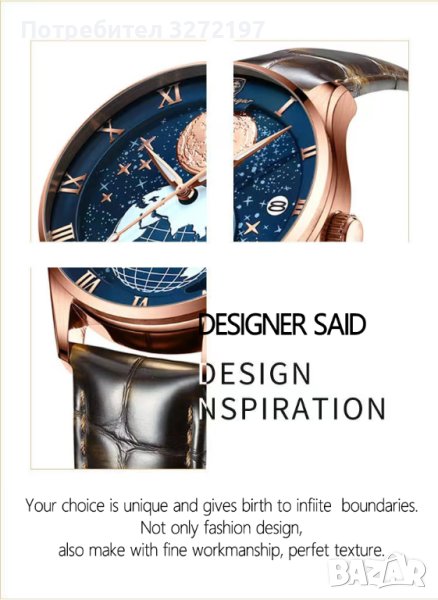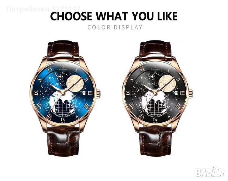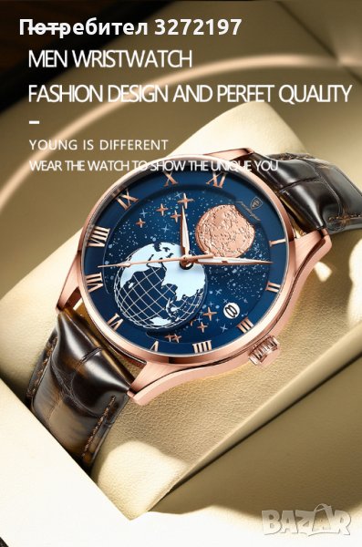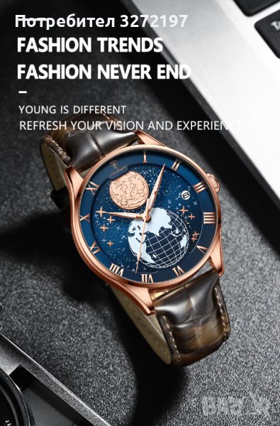 - Златен неръждаем метален корпус, син циферблат, кафява кожена каишка