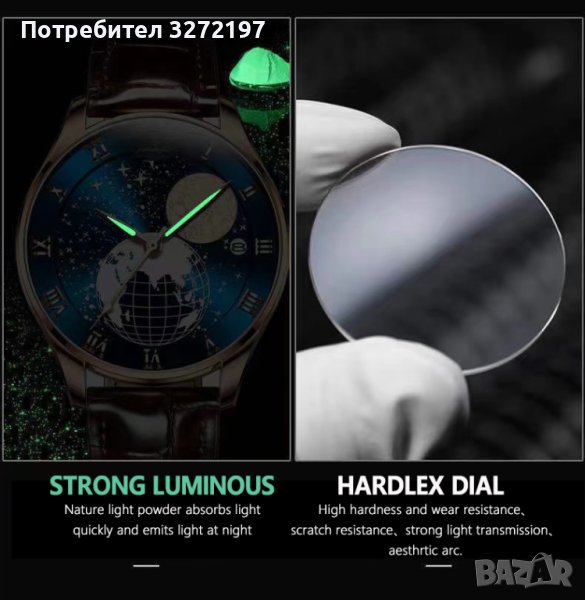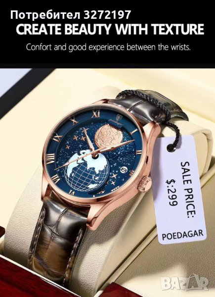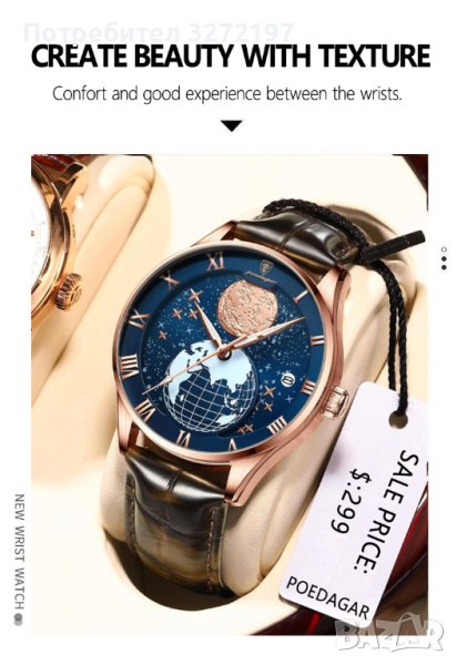 Mъжки кварцов часовник POEDAGAR MOON неръждаем метален корпус, кожена каишка, дата, луминисцентни стрелки, водоустойчив!