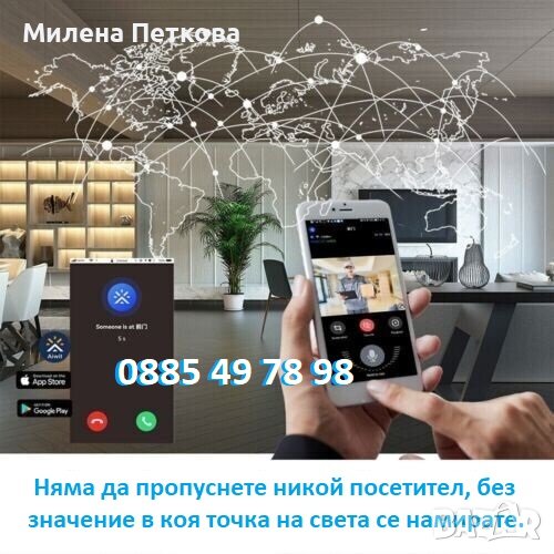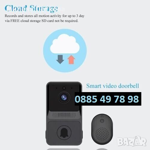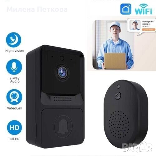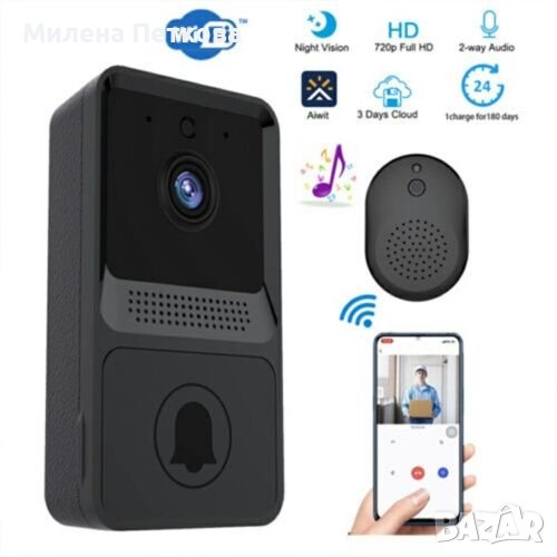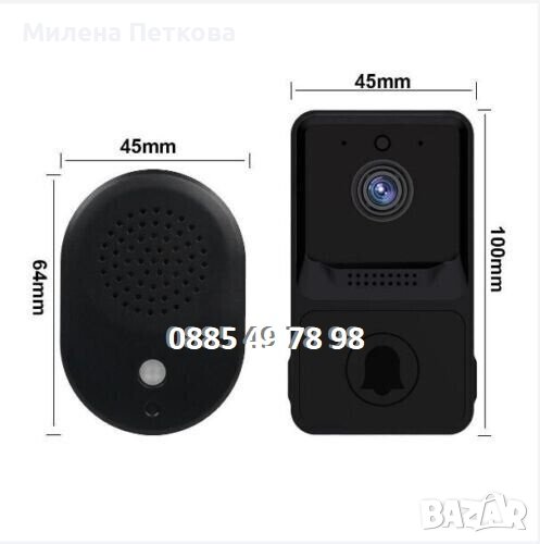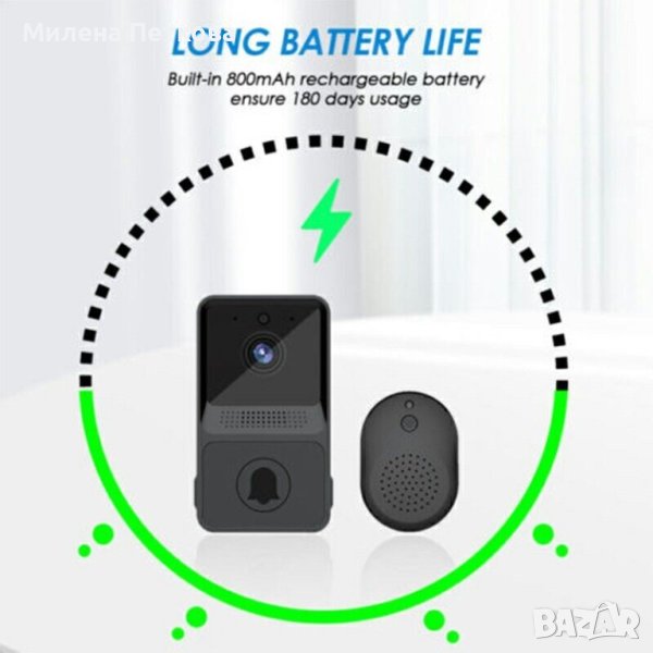 Нов продукт! Евтин, надежден и безпроблемно работещ интелигентен, водоустойчив, безкабелен видео звънец с HD камера и автоматичен режим на нощно виждане. Устройството осигурява стабилно двупосочно аудио и видео връзка, има голяма вградена презареждаема батерия (издържа до 6 мес.) и приложението с което работи е налично за iOS и Android. За да може да се възползвате от всички функционалности на този видеозвънец е необходимо ПЪРВО да разполагате със Смартфон и ВТОРО видеозвънецът да има достъп до Wi-Fi мрежа. ТОВА Е ВСИЧКО!!! Когато имате посетител пред вратата, получавате известие (Звънене) на телефона си, след което само с едно докосване на дисплея вече виждате, кой е пред вратата ви, като освен да го наблюдавате Вие може и да разговаряте с него. В комплектът си видеозвънецът има и т.н. Ding Dong (вътрешно звънчево тяло), което се разполага в дома Ви и звъни и по традиционният начин, когато имате посетител пред вратата. Много удобно е, като по този начин ще чуете, че някой звъни дори ако в момента не сте край телефонът си.