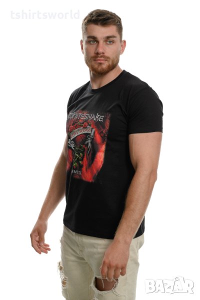 мъжка тениска в черен цвят с дигитален печат на музикалната група Whitesnake и техния албум Love Songs с дигитален печат и на гърба. Тениската е изработена в България под марката PRINTEX от висококачествен 100% пениран памук на 170 гр./м², който запазва цялостта на материята и наситеността на цветовете на черното трико дълго време. С удобна кройка, тениската е свободна и позволява максимален комфорт при носене. Професионално изработен висококачествен дигитален печат, устойчив на пране с години. Тениската може да се пере при температура до 40 градуса. Спокойно можем да гарантираме за качеството на изработката и ярките цветове на дизайна.