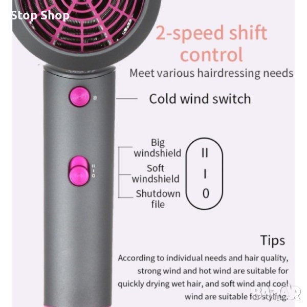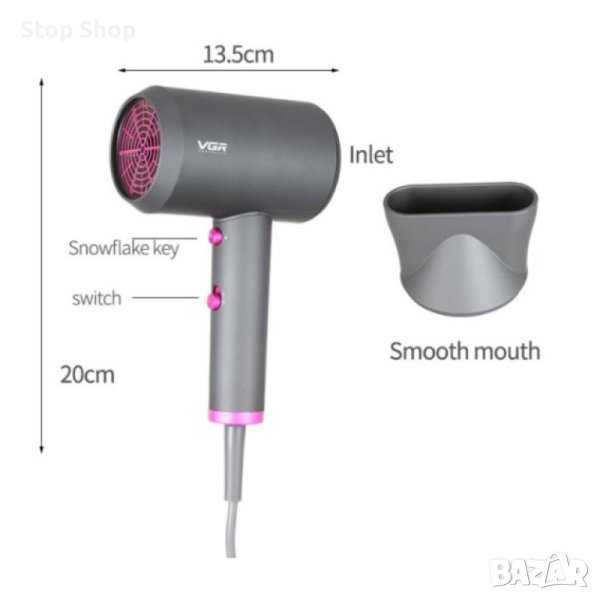 Това е универсален сешоар на фирмата VGR, с който не само можете да изсушите, но и спретнато да оформите косата си. Дръжката на сешоара е сгъваема и затова ще заема много по-малко място в пътната чанта. Сешоарът е с 2 скорости на мощността, отговорни за по-силна или по-слаба въздушна струя. Двете степени на температура помагат за регулиране на излъчваната топлината. Сешоарът е снабден и с бутон за охлаждаща функция, при която нагревателите спират да работят и се усеща студена въздушна струя. Благодарение на тази опция, уредът осигурява оптимална температура за трайно фиксиране на прическата, а също и предпазва косъма от допълнително изсушаване и загуба на влага. Уредът е със защита от прегряване, допринасяща за безопасна употреба.