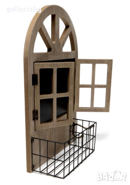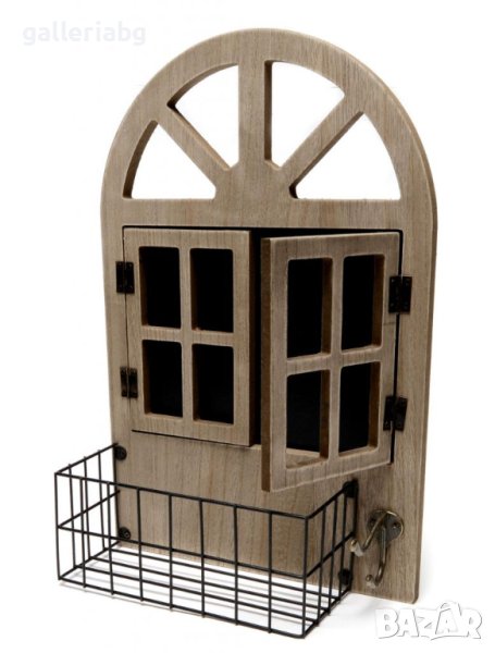 Декоративна дървена закачалка във формата на прозорец с метално кошче. Закачалката има кукичка за окачване на стена.