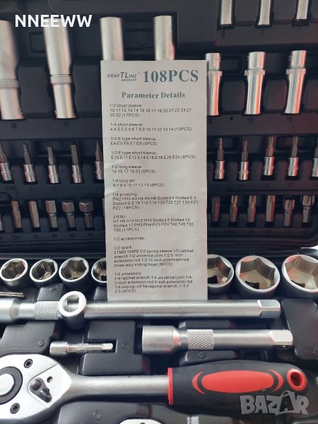 - 17 броя вложки 1/2'' къси: 10мм; 11мм; 12мм; 13мм; 14мм; 15мм; 16мм; 17мм; 18мм; 19мм; 20мм; 21мм; 22мм; 24мм; 27мм; 30мм; 32мм