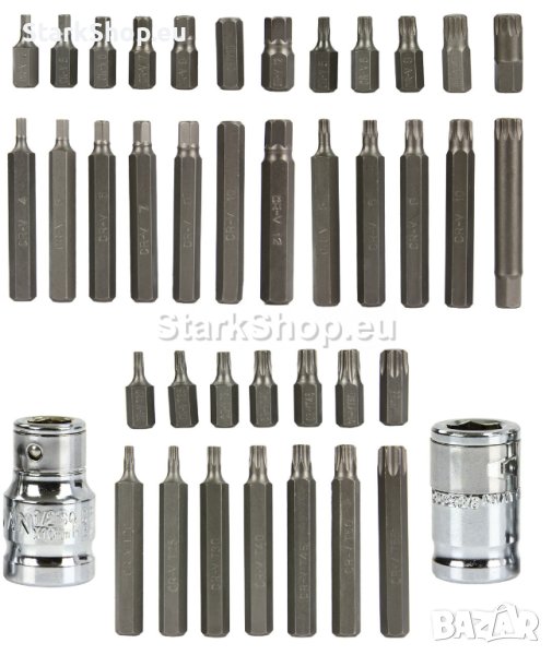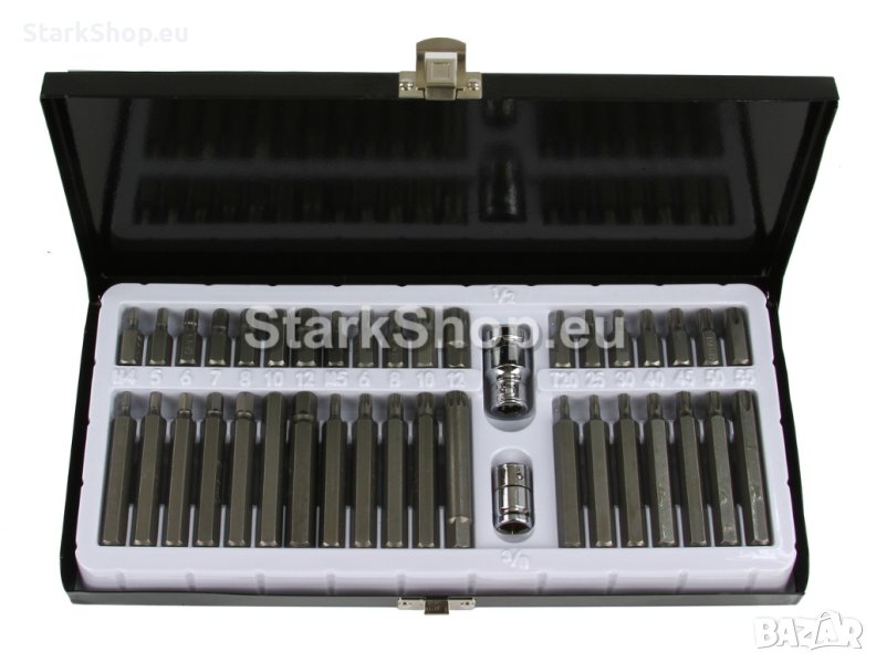 Комплектът включва 40 специализирани елемента. Широката гама от гнезда и битове ще ви позволи да извършвате много работи в механичните и автомобилните услуги. Използването на два адаптера в комплекта 1/2″ и 3/8″ ще позволи безопасна и разнообразна работа. Целият комплект е опакован в метален куфар.