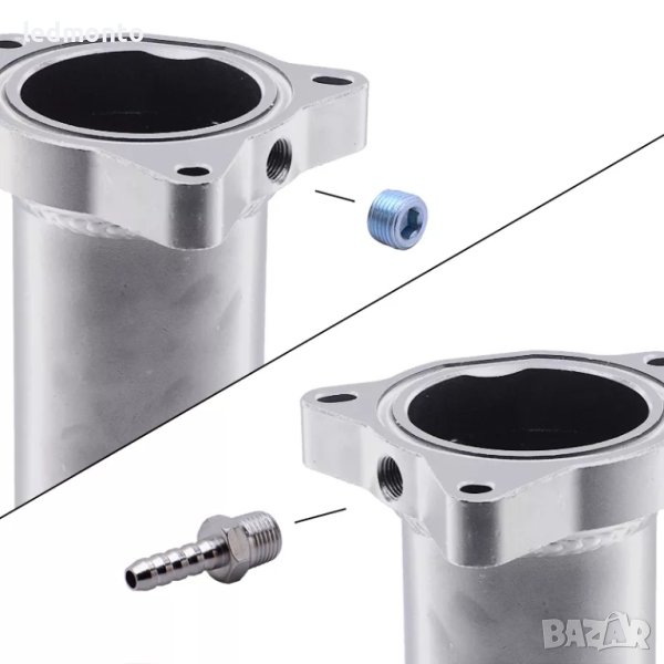 Този заместител за ЕГР клапан е изработен от единичен алуминиев блок чрез CNC машинна обработка, като има четкосано алуминиево покритие. В комплекта влизат всички части, които се виждат на снимките: