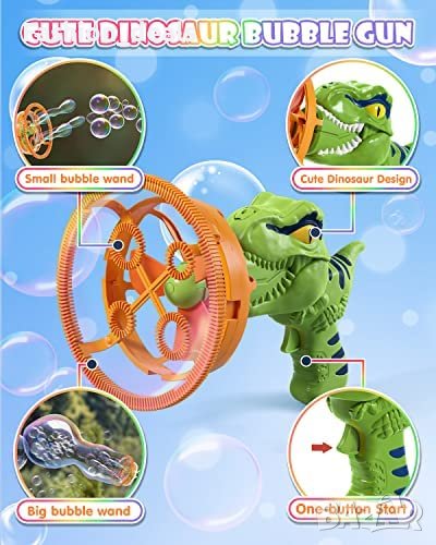 Машината за балончета Lehoo Castle Dinosaur за деца издухва дълготрайни големи балончета и безброй малки балончета за уникално и забавно изживяване. Тя е лесна за използване с мощен мотор, изисква 3 батерии и се доставя с 240 мл разтвор за мехурчета. Симпатичният дизайн на динозавър с удобна дръжка го прави удобен за децата, а висококачественият ABS материал с гладки ръбове осигурява безопасност. Това е идеален за партита на открито, рождени дни и водни дейности и е подходящ за деца над 3 години.