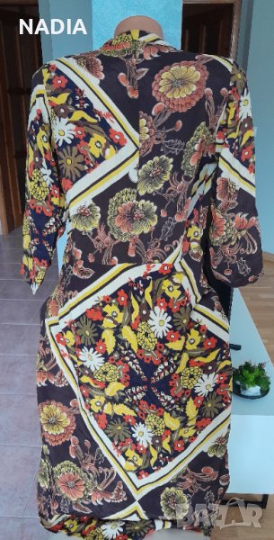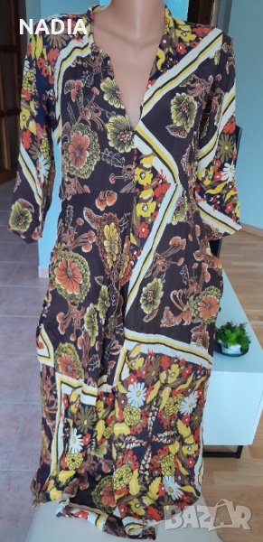 Рокля в пъстри цветове. Елегантно деколте, долната част е с прехлупване. Разполага с подплата дължина 115см, талия висока 44, от рамо до рамо 38, бюст 50