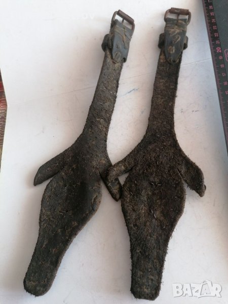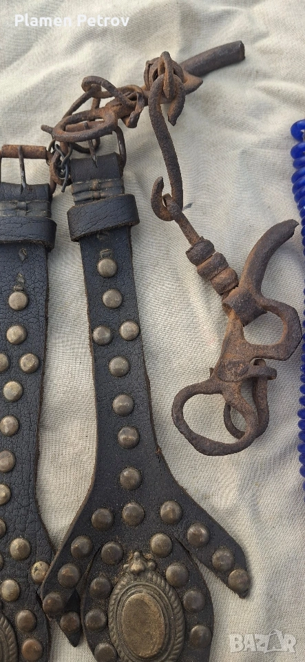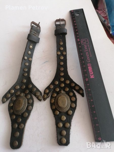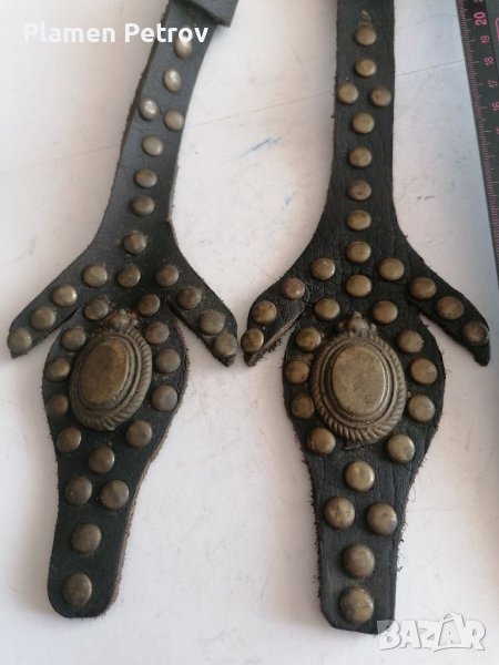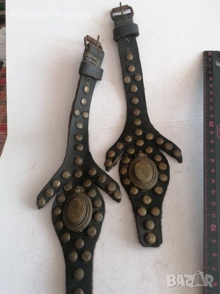 Стари орнаменти направени на естествена кожа с бронзови окраски за кон, катър, магаре с чапрази за закачване с размери от дължина 30 см и ширина 8 см в най широката си