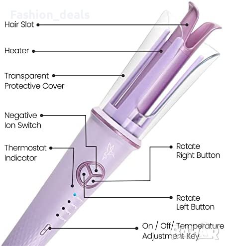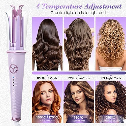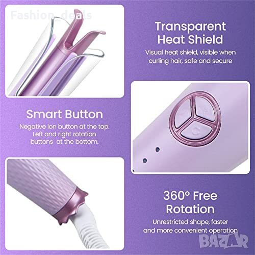 Автоматичната маша за къдрене на коса Olybeaut е снабдена с прозрачен защитен капак, който ви позволява да виждате къдрената коса и предпазва ръцете и лицето от топлината на повърхността. Тя има четири температурни настройки от 150 до 210 градуса и 9-секунден таймер за перфектни къдрици. Пресата има бутон с функция за отрицателни йони, който освобождава множество отрицателни йони в косата по време на процеса на оформяне, оставяйки косата копринена и блестяща. Освен това тя има специално предназначено гнездо за коса за по-безопасно къдрене и по-добри къдрици, както и автоматичен механизъм за обратно въртене, за да се избегне дърпането и заплитането на косата. Конструкцията включва въртящ се на 360° кабел за по-бързо и удобно използване и вградена функция за безопасност с 60-минутно изключване. Тя е лесна за използване, с чип за интелигентни функции с един бутон, който елиминира необходимостта от ръчни и заплетени начини за къдрене, което я прави подходяща за хора от всички възрасти и нива на опит.