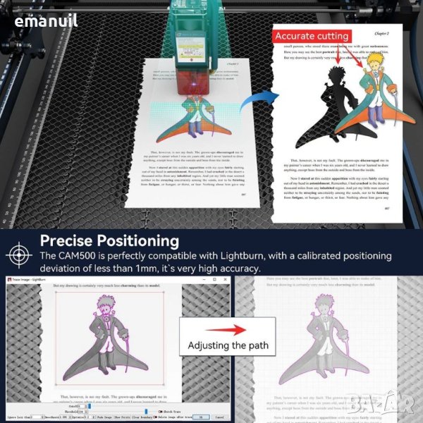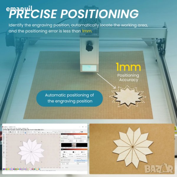 Автоматично локализиране-разпознаване дори на разпръснато поставени детайли и позоциониране на графиката за гравиране-рязане.