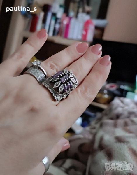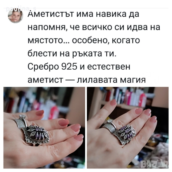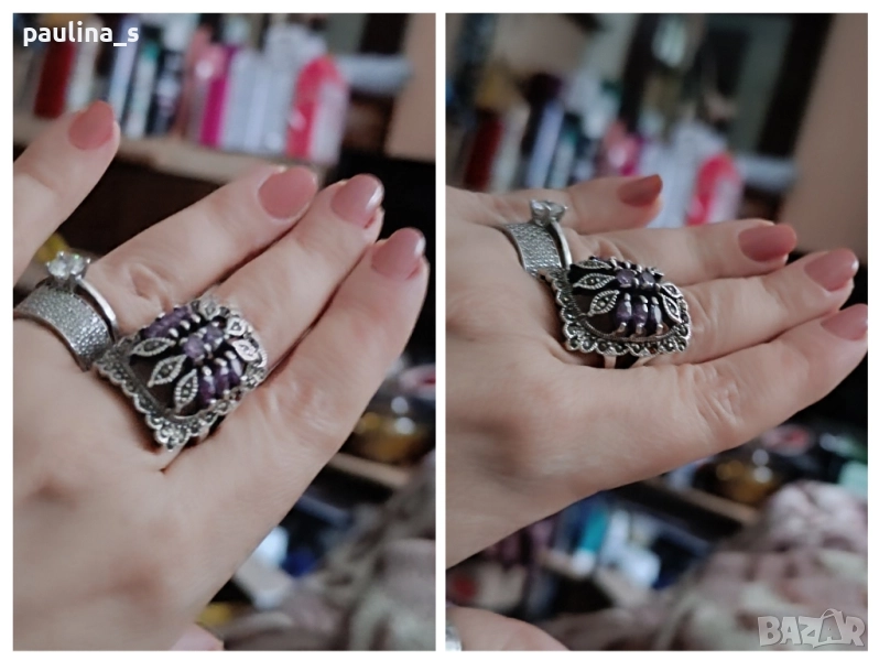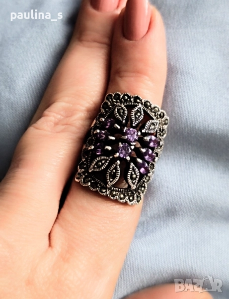 2️⃣. Колаж / Стар семеен сребърен пръстен с Лавандулови Аметисти. Цената е крайна, без пазарлъци 224,99лв / 115 евро. Уникален сребърен пръстен с Аметисти, шлифовка маркиза и марказити, с ефект на черен диамант. Размер 18мм вътрешен диаметър / 8. Без дефекти, съхраняван с грижа, маркиран и много ефектен. Не се продава на грамаж! Мащабирането е на дланта!