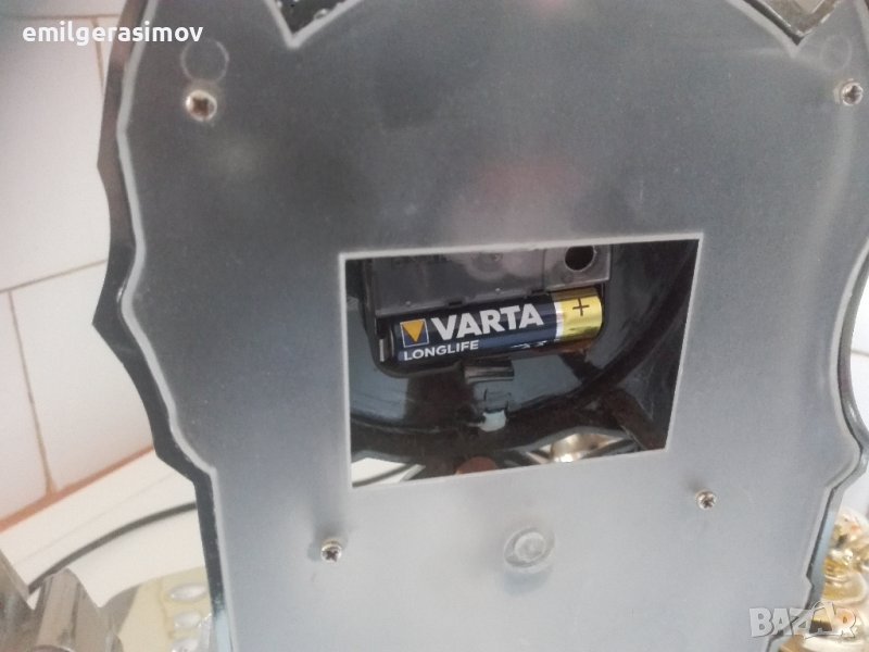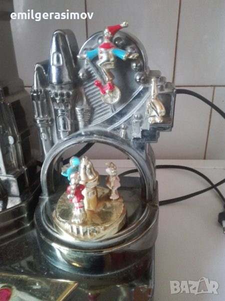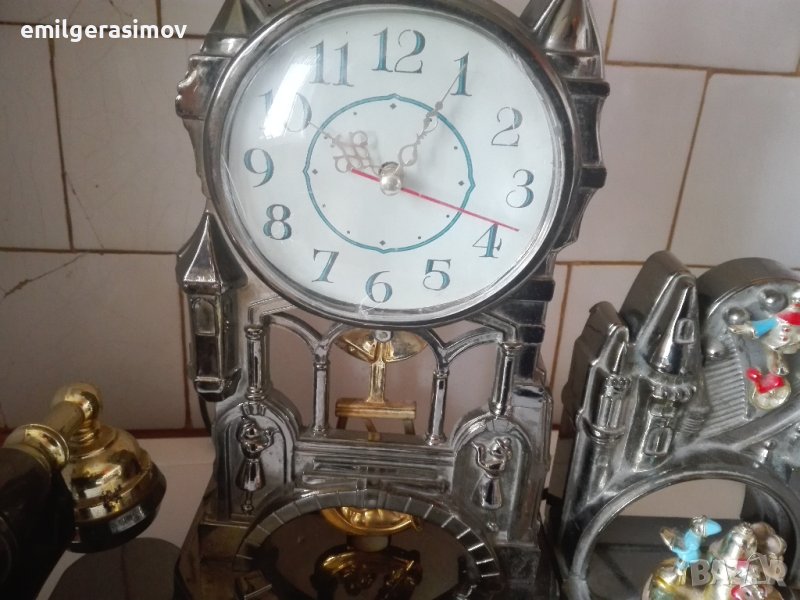 Часовникът е с кварцов механизъм с една батерийка от 1,5 волта.Работи точно. Нощната лампа се включва от бутоните на телефона и е с няколко степени на сила на светлината. Музикалната кутия също е работеща. Навива се чрез въртене на ринга вдясно от бутоните , след това той се развива в обратната посока и издава мелодия , която е от Лунната соната на Бетовен.Размери 36/23 см. Височина 55 см. Цена 50 евро.