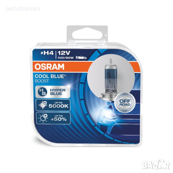 Новите OSRAM COOL BLUE BOOST са едни от най-мощните халогенни крушки.Отличават се със своята синя халогенна светлина наподобяваща тази на ксенонова крушка. Предлагат стилна визия с изключително висока яркост и мощност в сравнение с други халогенни лампи със синьо покритие. Подобряват значително видимостта дори в екстремни условия.Напълно безопасни за рефлектора или лупата на автомобила ви. Бяло-синята светлина се доближава максимално до светлината на фабричния ксенон.Подходящи за offroad.