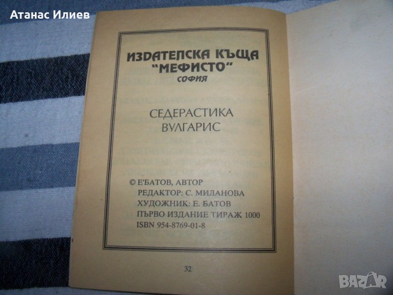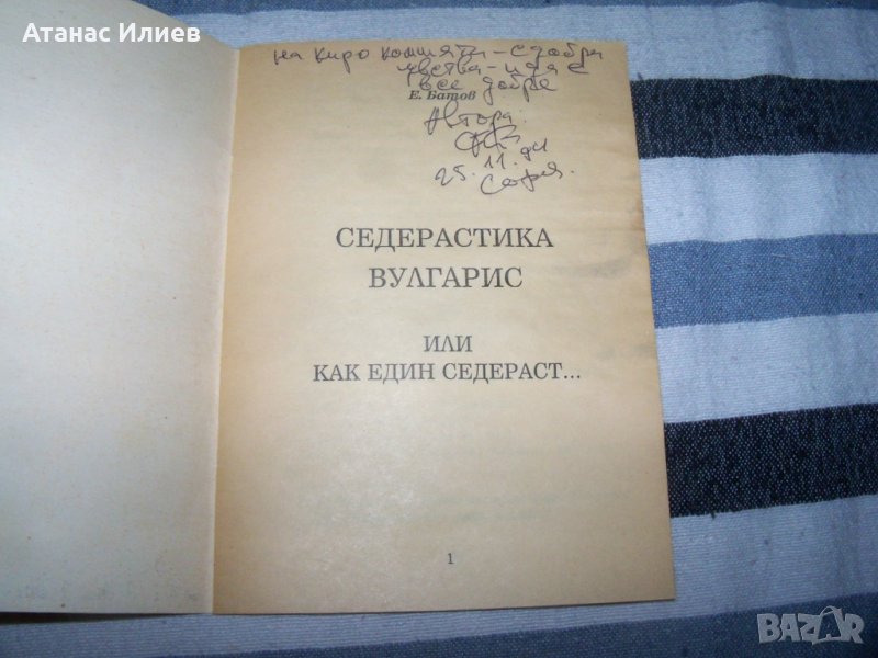 "Седерастика Вулгарис или как един Седераст ..." автор Е'Батов - Едуард Батов. Книжката е остра политическа сатира и е издадена в малък тираж през 1994г. от издателска къща "Мефисто" София. Книгата е с карикатури дело на автора. Книгата е с автгораф, меки корици, 32 стр. в много-добро състояние, с леки зацапвания на две-три страници.