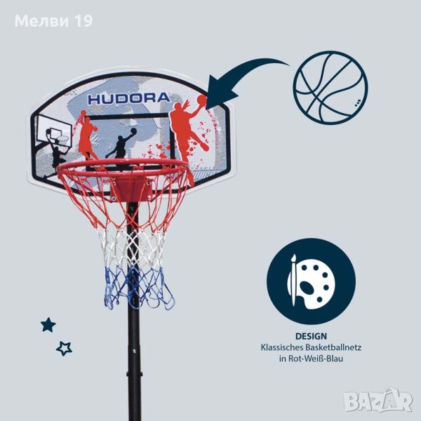 Баскетболното табло (70 х 45 см) е изработено от здрава пластмаса. Металният прът с диаметър 42 - 45 мм е прахово боядисан и закрепен към основата с две допълнителни обтегачи. Сигурна основа от стабилен винил. Просто напълнете с вода или пясък за оптимална стабилност (прибл. 28,7 l). Така баскетболната стойка е стабилна и не се накланя дори при по-силни мачове.