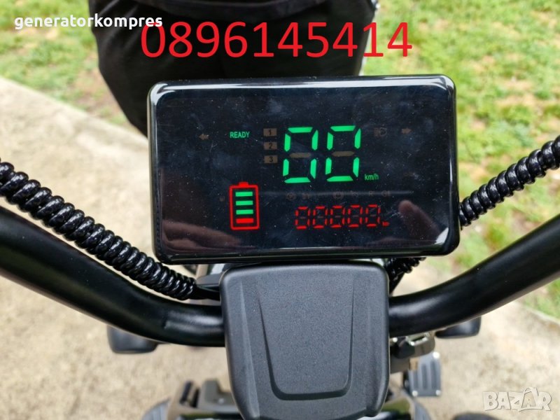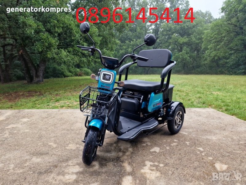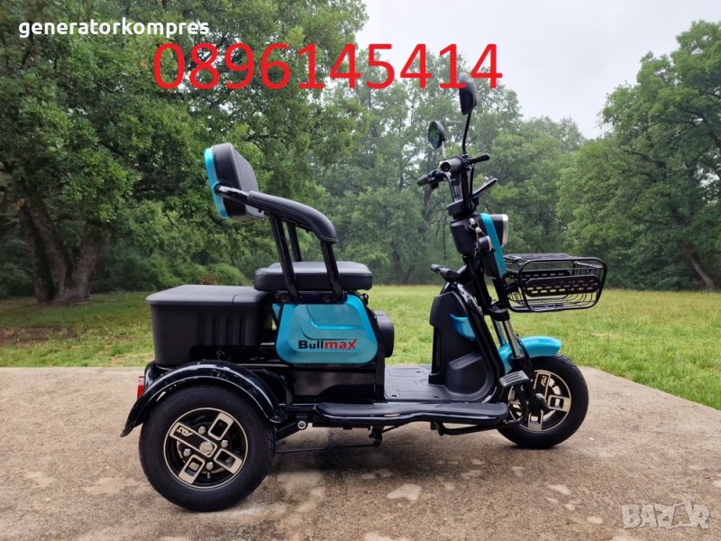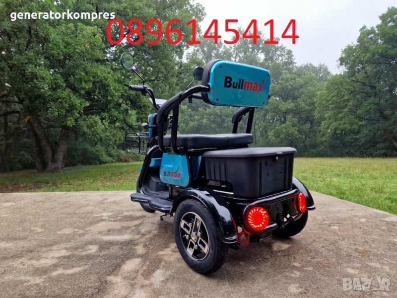 Предлагаме на Вашето внимание уникална двуместна триколка BULLMAX C1 серия BLUE – без аналог на пазара. Триколката е с дигитално табло, три нива на скоростта, стопове, мигачи и габарити,LED фар. Предна и задна ръчни спирачки. Крачна спирачка. Голям кош за багаж. Триколката е с вградена втора седалка за допълнителен пасажер и трета седалка за малък човек. Триколката е изцяло подсилена като окачване и е подходяща за по тежки хора..