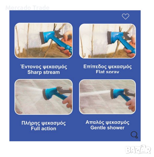 Съдържа 4 аксесоара, адаптер за кран и пластмасови конектори. Регулируемата пръскаща глава ви позволява да изберете режима, който искате според вашите нужди, от интензивен спрей, пълен, мек или плосък.
