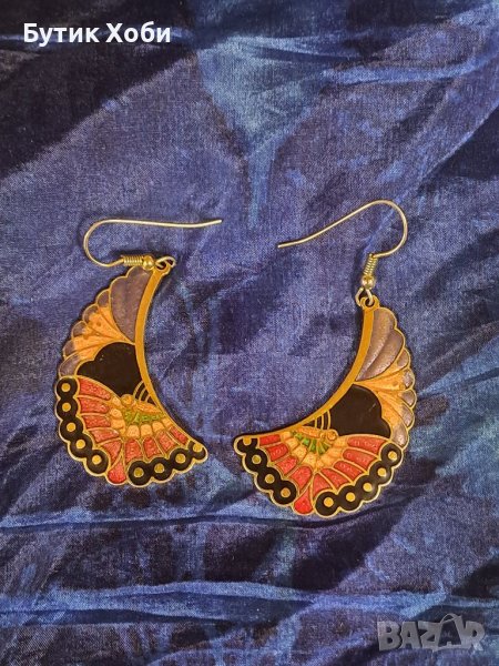 Обици изработени в техника клетъчен емайл, клоизоне. Свежи антидепресантни цветове, перфектно състояние Размери : без държач - 3,5см, с държач - 5,5см.