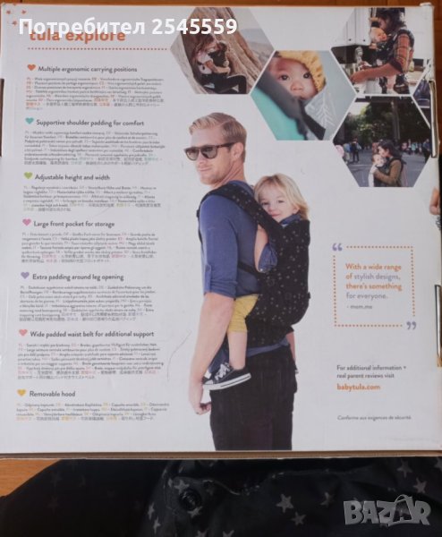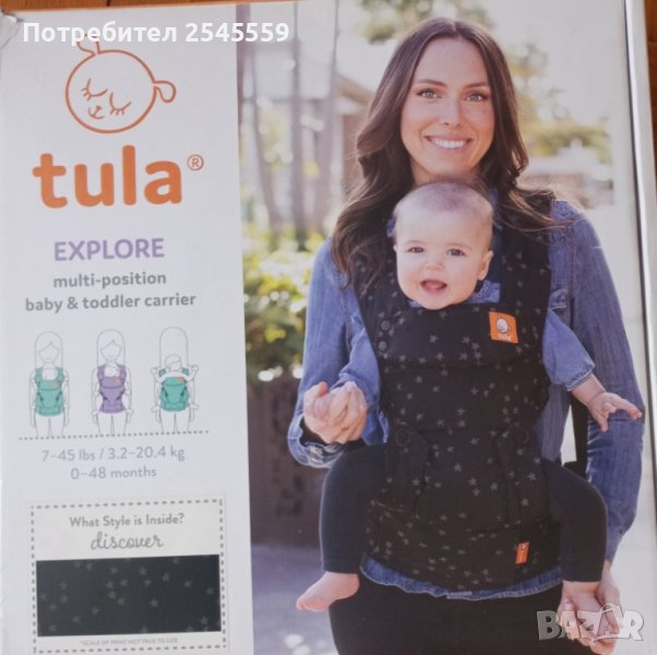 Ергономична раница Tula Explore позволява носене на гръб, с лице към родителя и носене с лице напред. Подходящ е за носене на новородено бебе от 3.2 кг до 20.4 кг. Панелът на раницата има 3 позиции на нагласяне на ширина - от 13 до 38 см. Панелът на раницата се наглася на височина чрез сваляне или повдигане на възглавничката, служеща и за опора за тила. Поставя се лесно, осигурява широка седалка и подкрепя естествената позиция на буква М на таза и крачетата на бебето. Подплатена възглавничка за подкрепа на бебешки главичка и врат на новородени или спящи бебета. Има премахваща се качулка, с възможност за регулиране. Може да се пере в пералня, има джоб на колана на талията. Материята е дишаща, 100% памук.