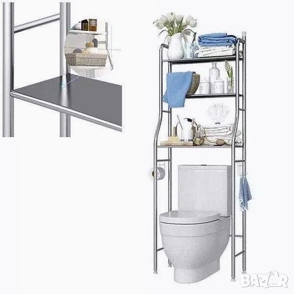Устойчиви, дълготрайни материали няма да ръждясват или обезцветят. В комплекта са включени и няколко кукички за кърпи/закачалки. Най-добра цена за стоманена етажерка над тоалетна или за над пералня 17.99 евро.