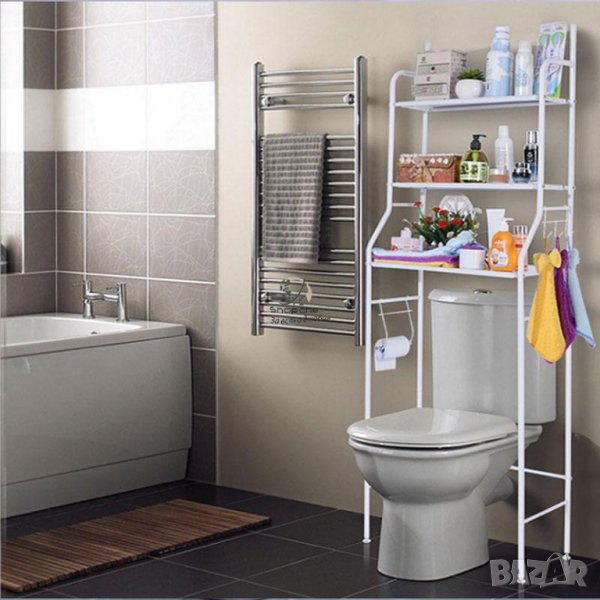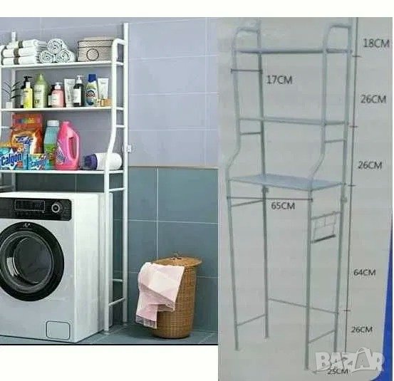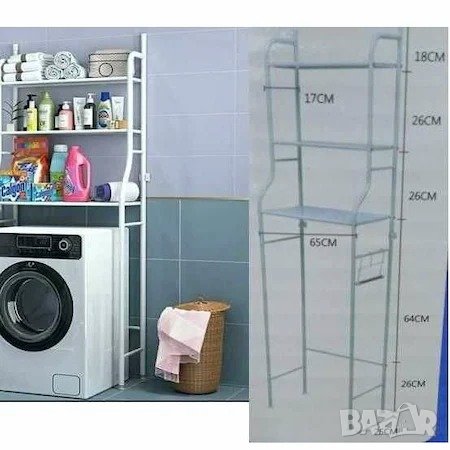 Прахово боядисана, голям размер. Вече имате допълнително място над пералнята или тоалетната. Без дупчене. лесно сглобяване. Практичен и удобен стелаж, който ще подреди всички препарати, хавлии и тоалетни аксесоари. Снимка 1, 2 и 3, точните размери се виждат на снимка 2, само ширината е 47 сантиметра на етажерката над тоалетна и съответно 65 сантиметра широчина на етажерката над пералня/сушилня.