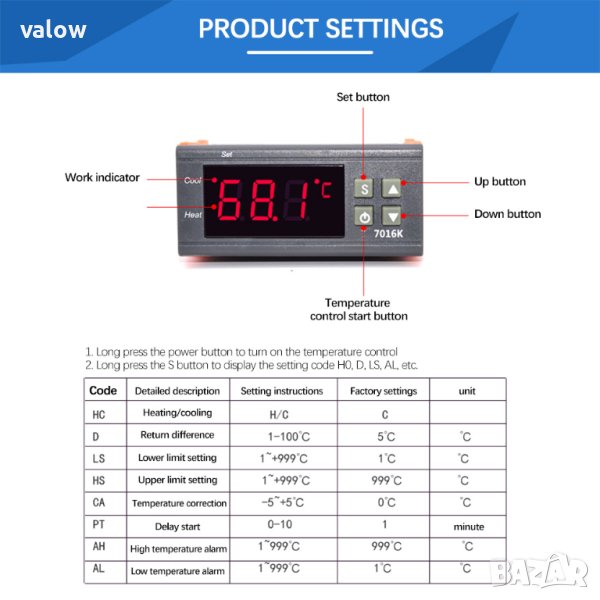 Терморегулатор за печки, инкубатори, хладилници и др., с външна сонда включена в комплекта. Позволява да се регулира температурата в диапазона от -50°C ~ 999°C с разделителна способност 0,1°C.