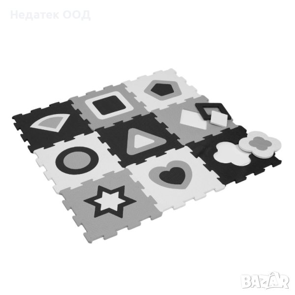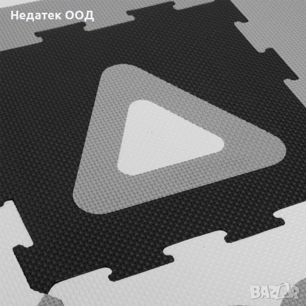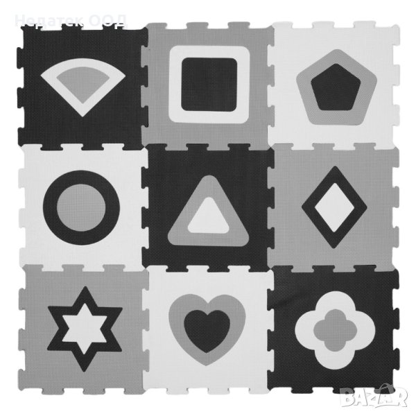 Подов пъзел с пенести меки черни и бели части, които се сглобяват като пъзел и създават удобна повърхност за безопасна детска игра. С геометрични фигури, които обучават и забавляват детето.