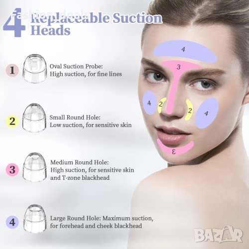 3 нива на засмукване и 4 смукателни глави за различни типове кожа и области на лицето