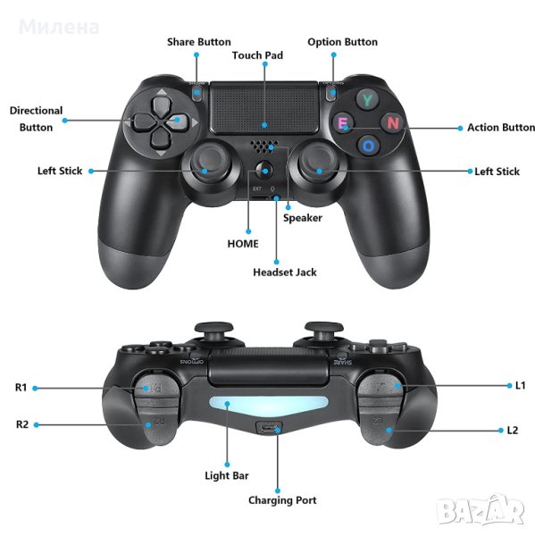 Безжичният джойстик Double-motor Vibration 4 е съвместим с PlayStation4. Той съчетава революционни функции и комфорт с интуитивен, прецизен контрол. Разработените аналогови ”гъби” и бутоните за задействане предлагат несравнима точност при всяко движение, а иновативните технологии Ви предоставят прекрасна възможност да изживеете своите игри по нов начин и да споделяте най-важните си моменти. Революционните функции като touchpad, интегрирана светлинна лента и вграден високоговорител предлагат вълнуващи нови начини за изживяване и взаимодействие с Вашите игри, а 3.5mm аудио жак предлага практично аудио решение за геймърите, които искат да слушат своите игри на спокойствие. Чрез бутона "Споделяне" (SHARE) може да споделяте моменти от играта Ви.