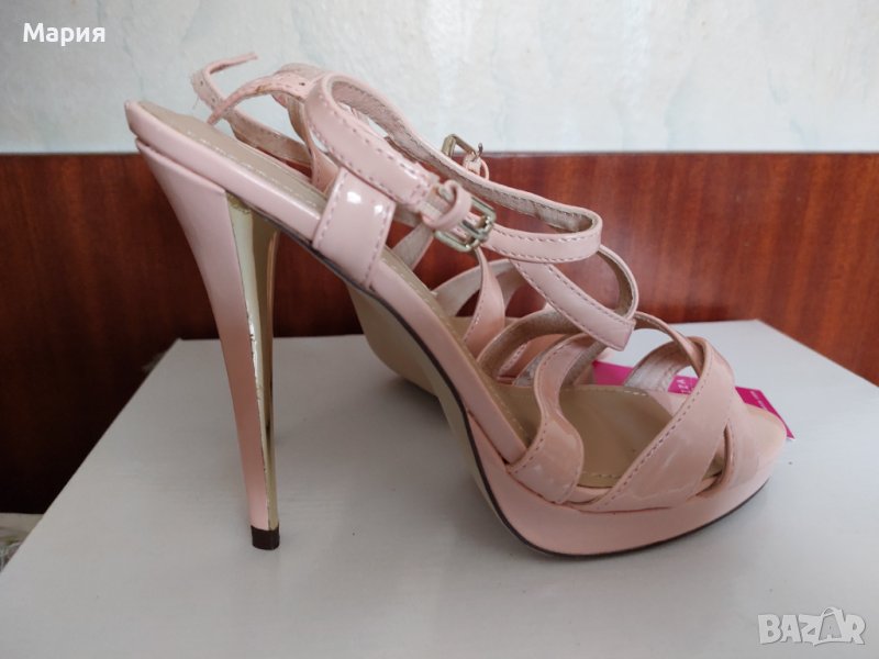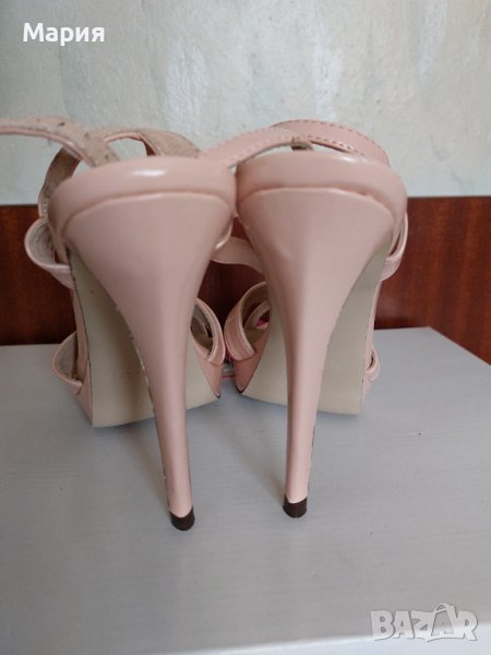 Елегантни сандали на висок ток, цвят пудра. Много ефектни, токът отзад е златист. Чисто нови с етикет и резервни капачета.