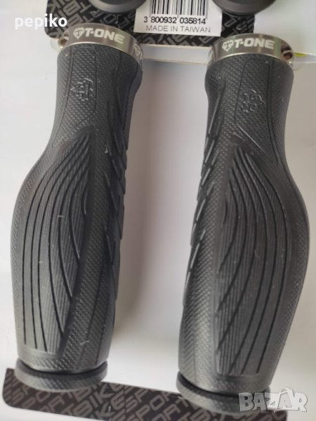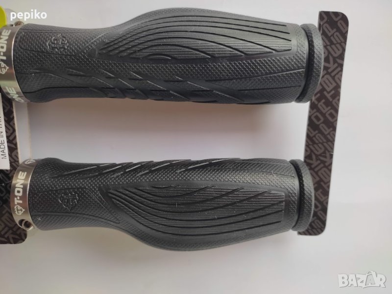 Комплект НОВИ грипове за велосипед T-ONE,два броя силиконови грипове за кормилото на велосипед с алуминиеви стяжки в двата края,ергономично оформени за дланите на ръцете,завърсващи с тапи,производител Тайван,много дудобни.