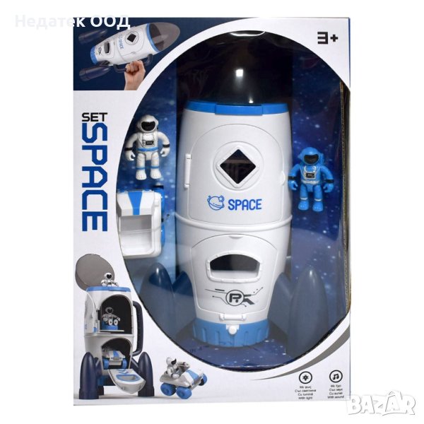 Космически комплект, включващ космически кораб с отварящи се врати, превозно средство и 2 фигури на екипаж на мисия за изследване на космоса.Работи с 2 батерии АА (не са включени).
