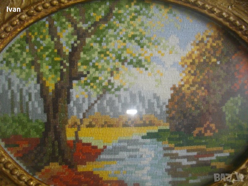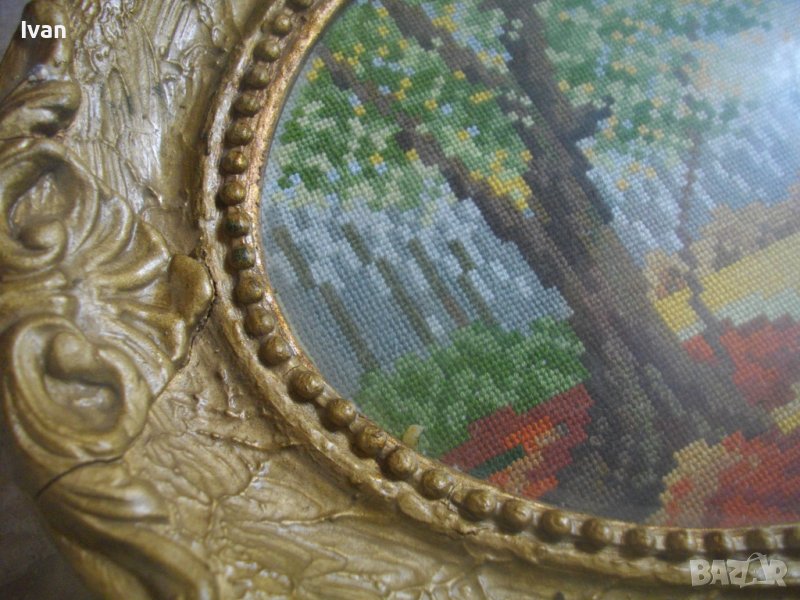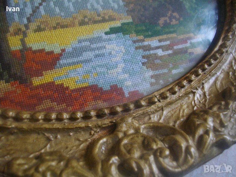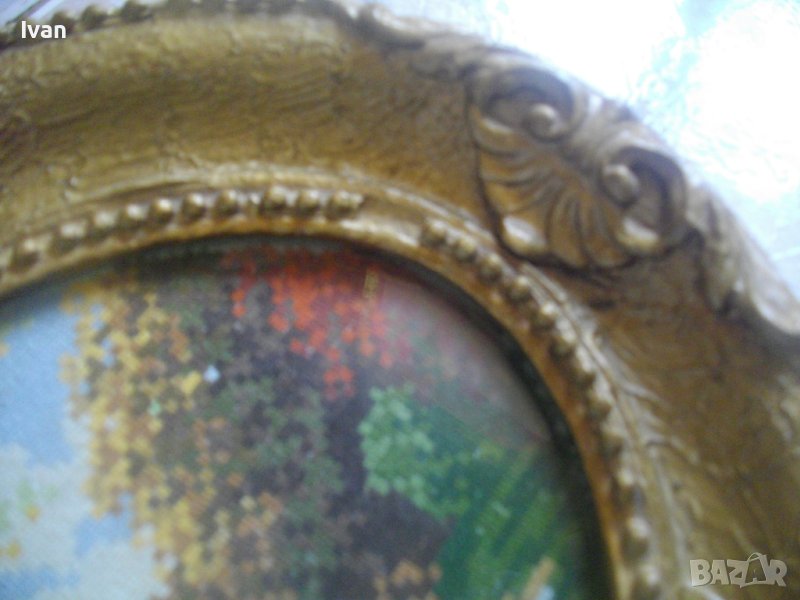 Цена на гоблена от обявата - елипсовиден 300 мм х 240 мм рамкиран от времето на Соца в НРБ - 299 лв.