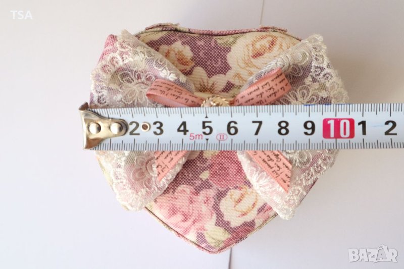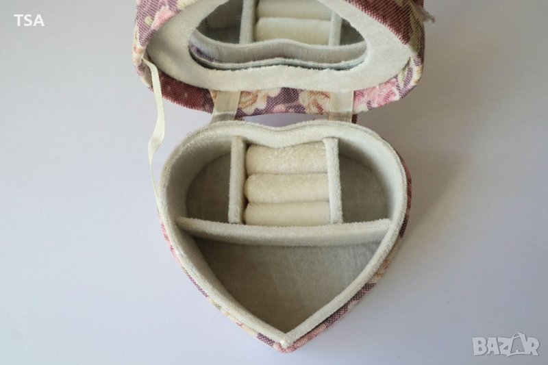 Красива текстилна кутия за бижута във формата на сърце с уникални детайли. Разполага с отделения за пръстени, колиета, обици и други бижута. Върху вътрешната част на капака има огледало. Чудесна идея за подарък.