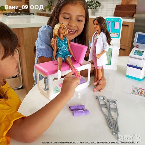 Опознайте забавния свят на медицинските грижи с комплекта за игра Barbie® Fast Cast Clinic™! Когато момичетата играят с Barbie®, те си представят всичко, което могат да станат, а тези, които обичат да се грижат за другите, може да играят с Fast Cast Clinic™! Клиниката е в комплект с тъмнокоса кукла Barbie® доктор (12 инча/30,40 см) и има 4 зони за игра: медицинска станция, маса за преглед, рентгенов апарат и магазин за подаръци. Децата могат да гипсират своята кукла „пациент“ (продават се отделно) с реалистична функция за изработване на отливки (използвайте розово, лилаво или бяло тесто), с които да гипсират ръцете и краката на пациента, както и да направят превръзки с машината за превръзки. Комплектът включва 30+ части за игра: 3 контейнера за тесто, отливка за крак, отливка за ръката на куклата Chelsea®, комплект патерици, стикери, рентгенов апарат, артикули от магазина за сувенири и др. Някои от аксесоарите са с клипс, така че куклата Barbie® доктор да може да ги държи за още по-реалистична игра! Децата ще се влюбят в безкрайните възможности за игри, изпълнени с креативност и забава! Куклата не може да стои изправена сама. Цветовете и декорациите може да се различават. Това е чудесен подарък за деца над 3 години.