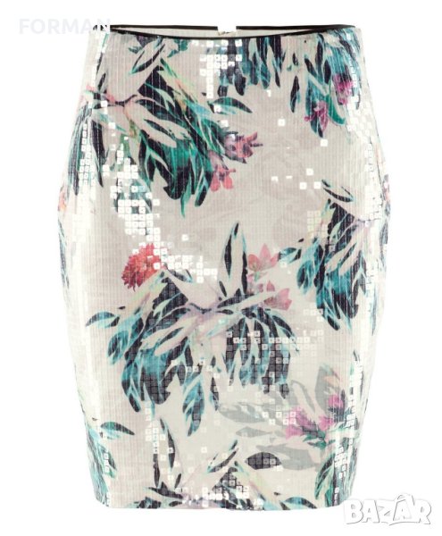 Бяла къса пола тип молив цялата в пайети с тропически принт → Обява 40503109