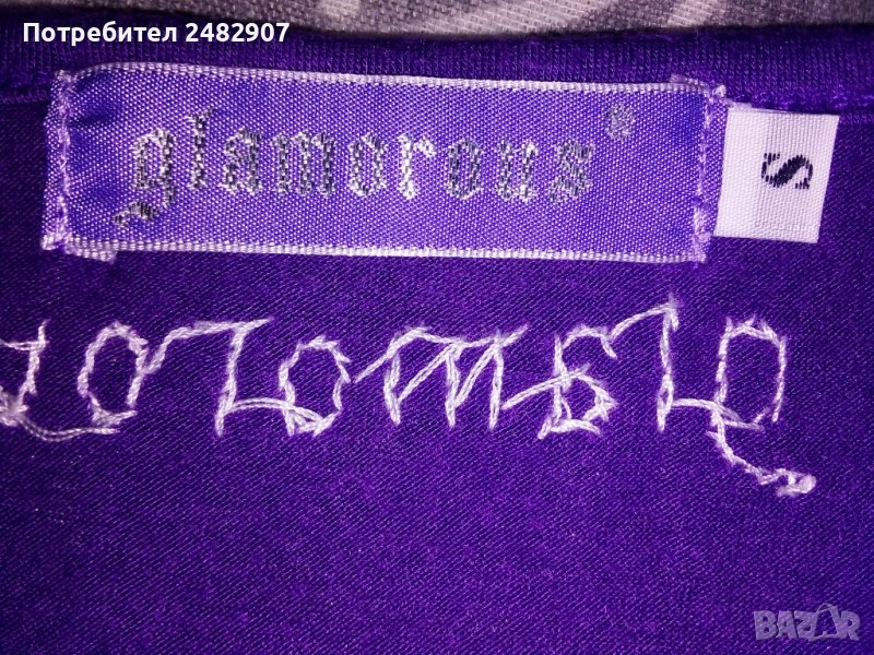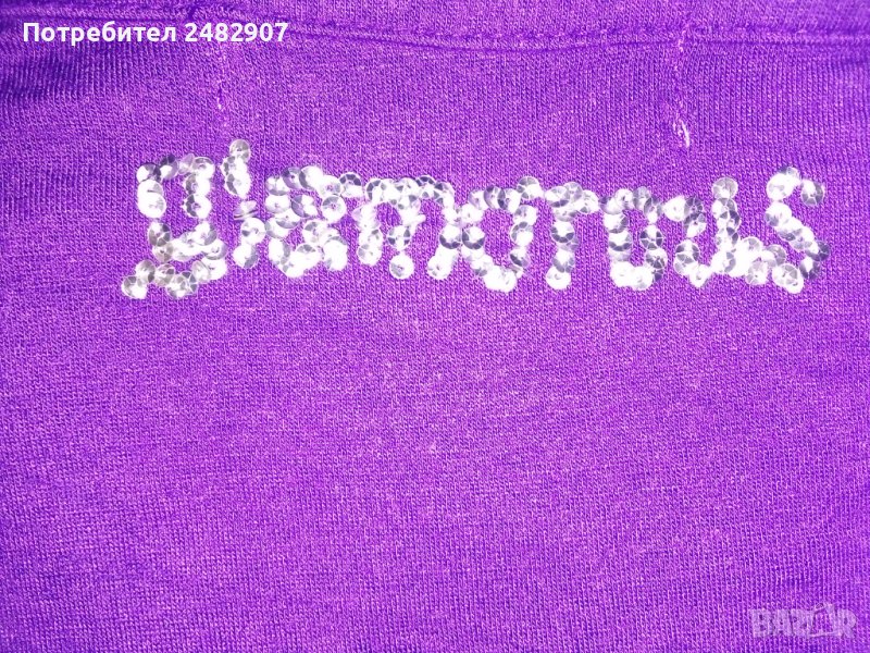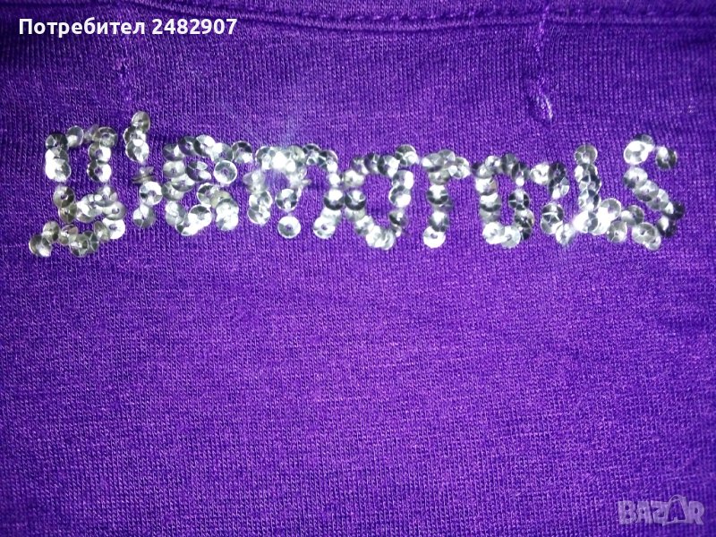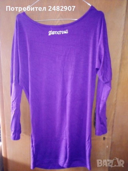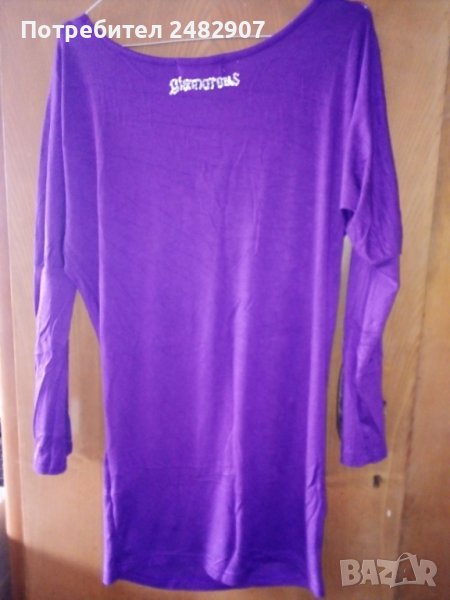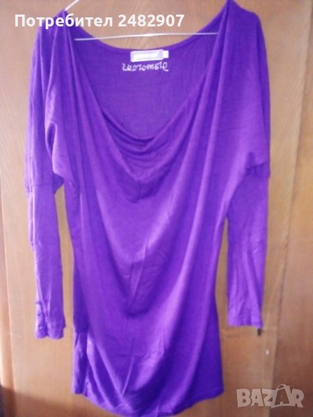 Дамска туника в лилаво, размер S, уголемена с паднали дълги ръкави. Ширина в долната част - 41 см, дължина на ръкава от деколтето - 65 см, дължина от рамото до долу - 80 см. На двата ръкава има по три броя декоративни перлени лилави копчета. Съдържа 95 % памук и 5 % еластан. Много запазена, почти не е използвана.