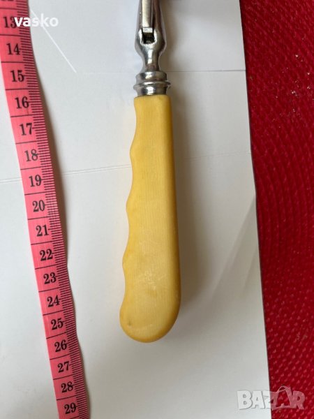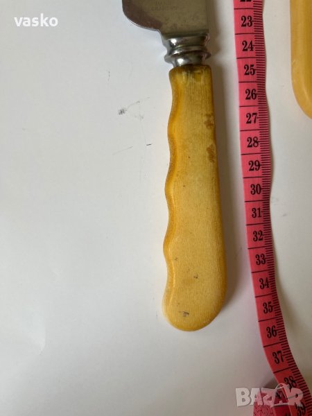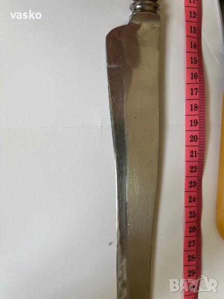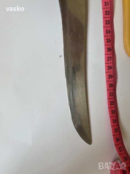 Нож Шефилд,английски,маркиран,обща дължина 34см,дебелина на острието при дръжката 2мм и напред изтънява,много жилава стомана,пластмасова дръжка,здрав без луфтове и хлабини+вилицата,масивна и здрава.Пластмасови дръжки,използвани.Цената е за ножа и вилицата.