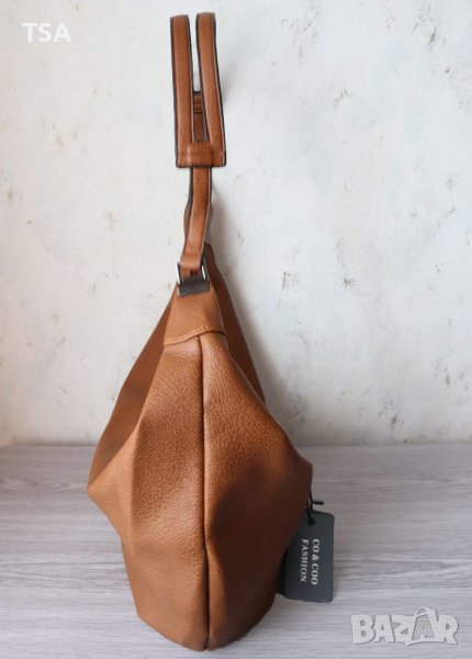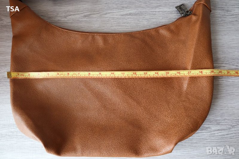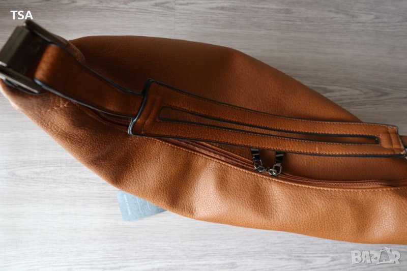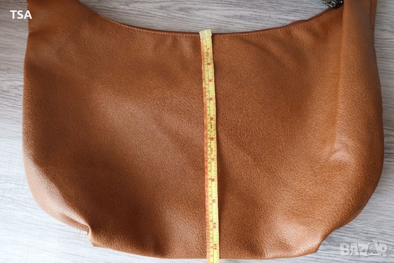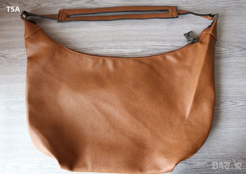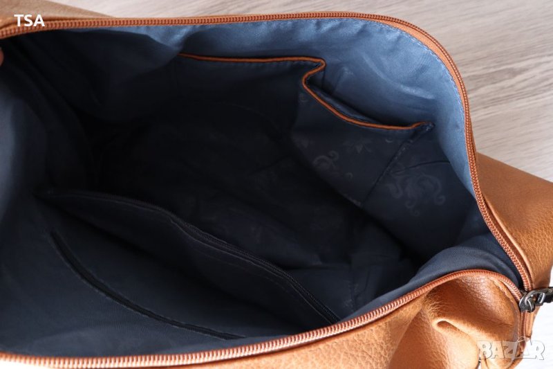 Стилна дамска чанта от еко кожа. Има лек дефект - изтъркване отстрани (снимка 2), поради тази причина е намалена. Разполага с основно отделение, затварящо се с два ципа по цялата дължина.