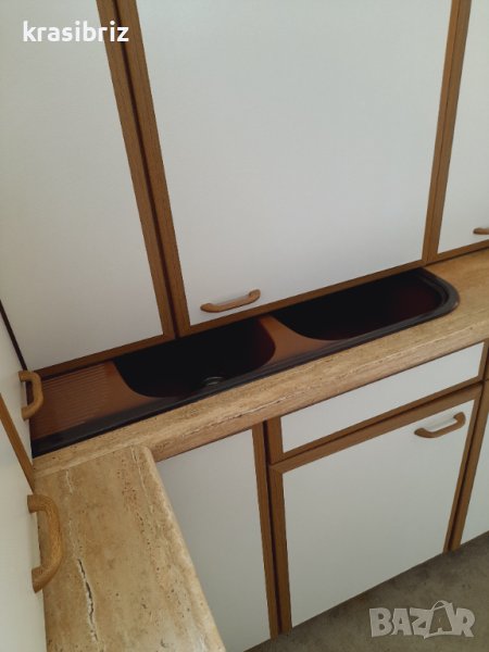 Кухнята включва:Вграден Хладилник,Вграден Фризер,Фурна с Керамични Котлони,Абсорбатор,Двойна Керамична Мивка с Батерия.