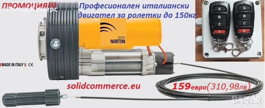 Професионален италиански мотор(двигател) GRUPPO NORTON за ролетка(щора) до 150кг в комплект с централа и 2 дистанционни.Цена на комплекта 159евро(310,98лв) с включен ДДС.