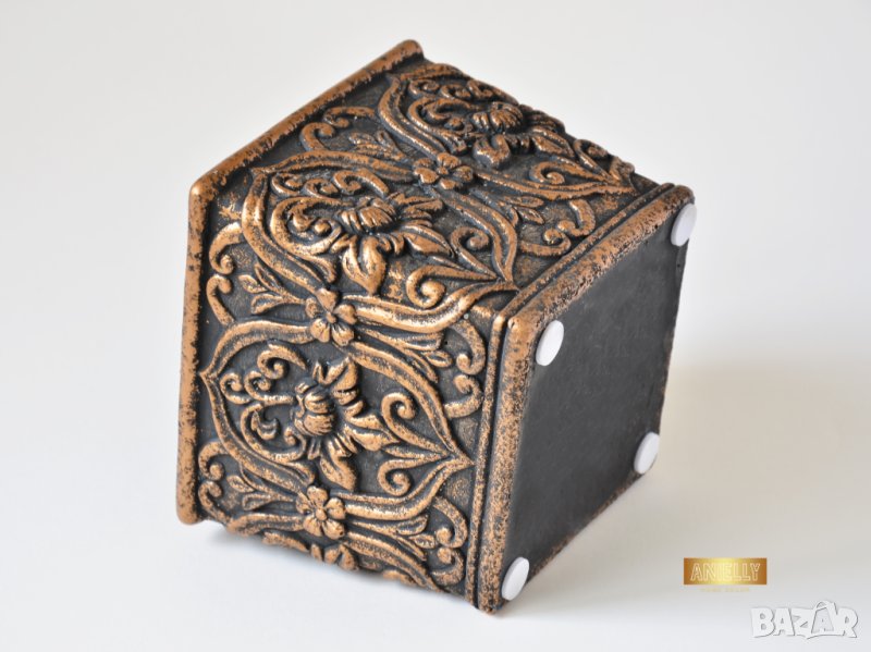 Този артукул представлява уникална кашпа с орнаменти. Елегантният дизайн в меден цвят и изпипани детайли придават на кашпата вид на антика. В нея могат да бъдат поставени изкуствени или естествени цветя, скандинавски мъх, сукуленти, свещи или гримове.