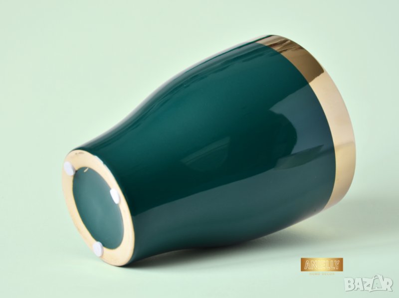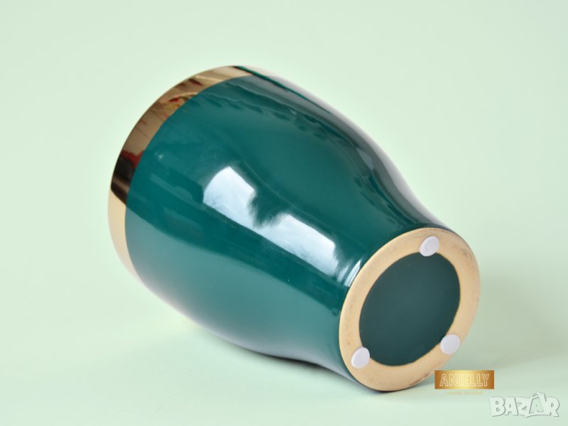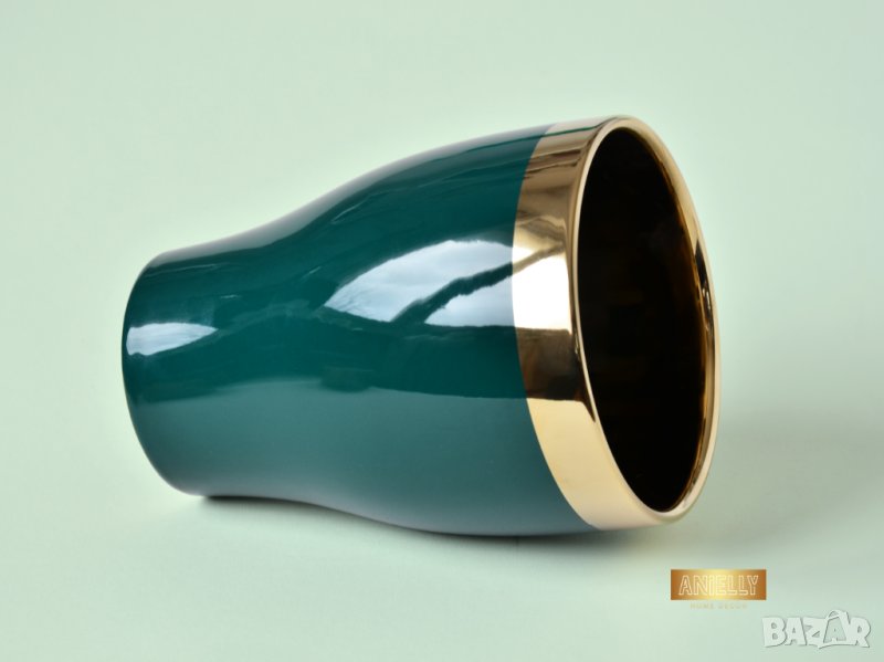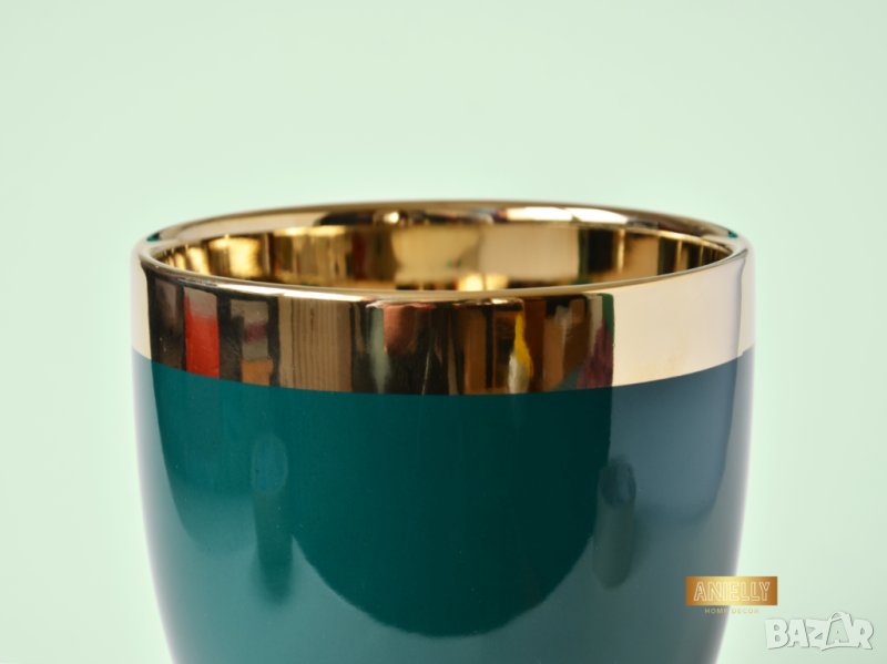 Този артукул представлява уникална саксия в тюркоазен цвят. Елегантният дизайн с гланцирано покритие, златен кант и изпипани детайли подсилват модерния вид на саксията. В нея могат да бъдат поставени изкуствени или естествени цветя, скандинавски мъх, сукуленти, свещи или гримове.