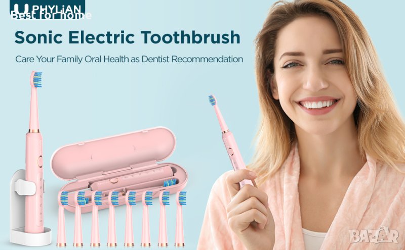 Звукова електрическа четка за зъби PHYLIAN,8 глави,акумулаторна,3 часа бързо зареждане за 120 дни