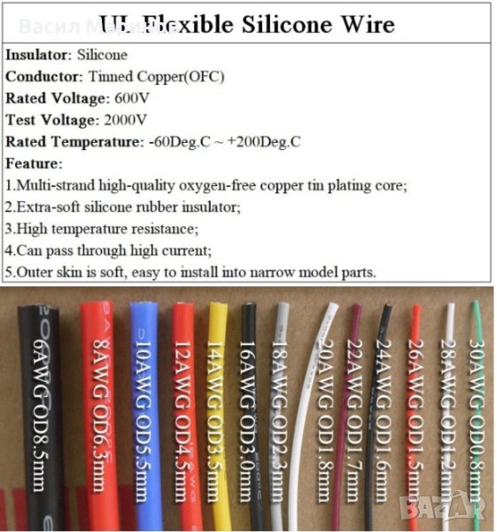 Продавам висококачествени силиконови кабели, с калайдисан меден проводник , издържат от -60 до 200 градуса температура, многожилни, много гъвкави и удобни за работа. Изолацията се маха лесно. Подходящи за всякакви AC и DC схеми и напрежения до 600V.