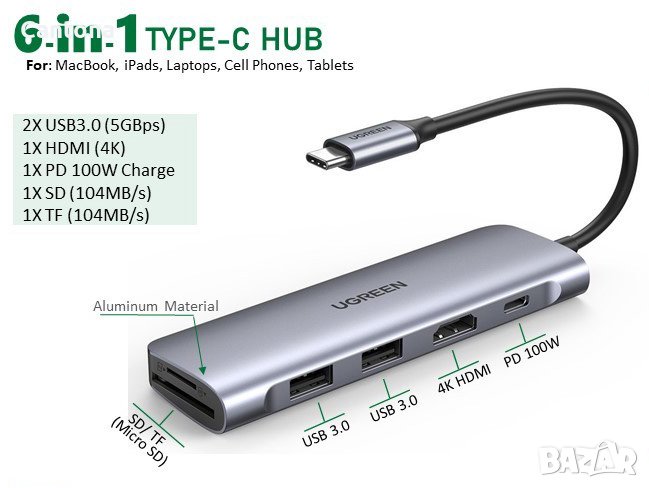 - Разширете възможностите си с повече портове, за да свържете повече устройства и да улесните работата си. UGREEN 6-в-1 USB-C хъб разполага с 4K HDMI изходен порт, четци за SD и TF карти, 2 USB 3.0 порта и 100 W PD порт за зареждане. И всички концентратори могат да работят едновременно.